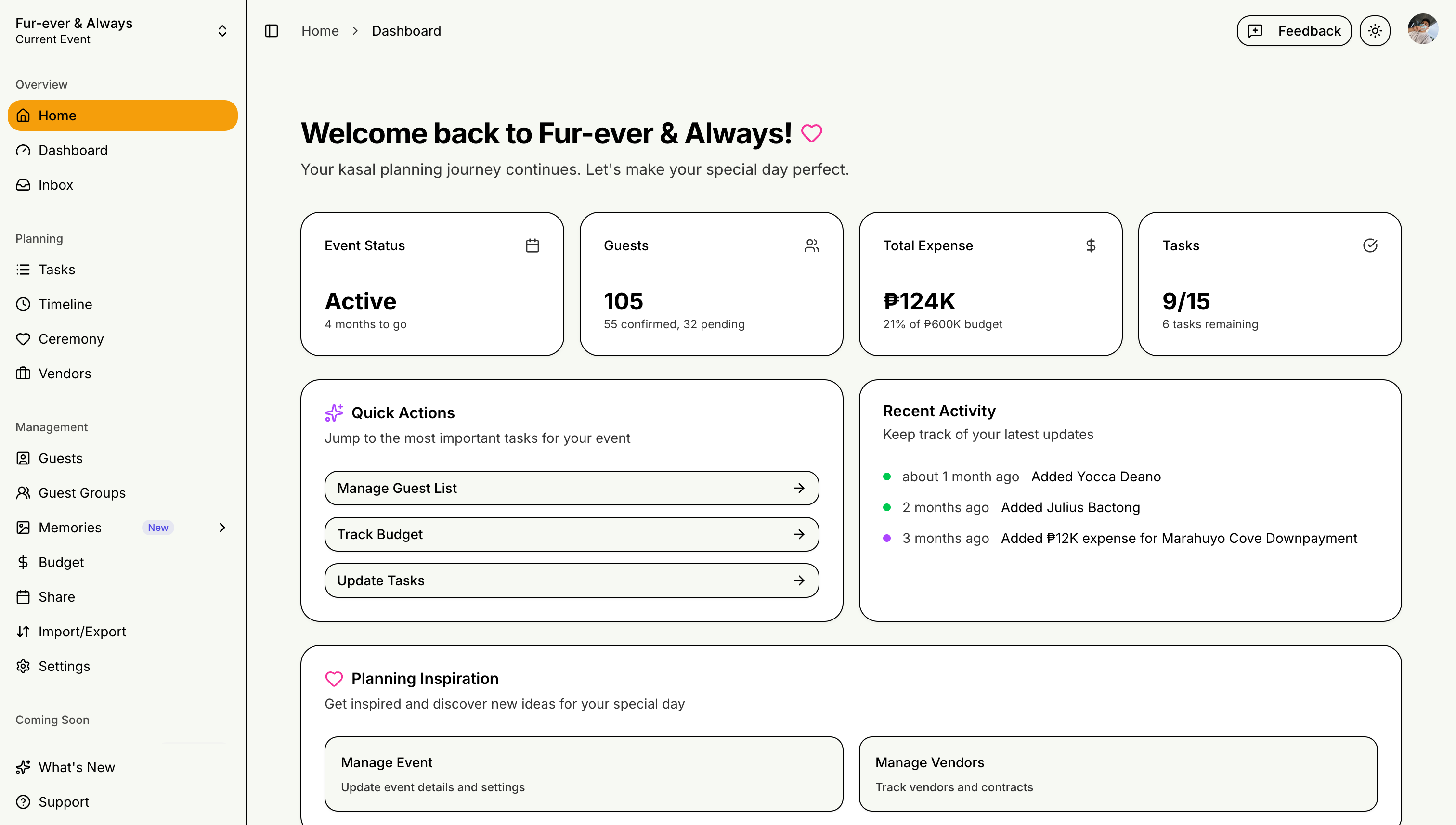 Your dashboard is your wedding planning headquarters - bookmark it and check regularly to stay on top of your kasal planning progress!